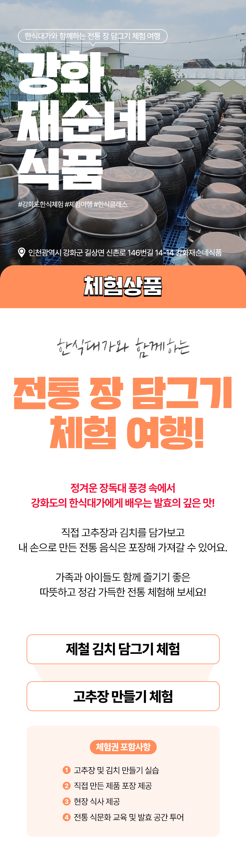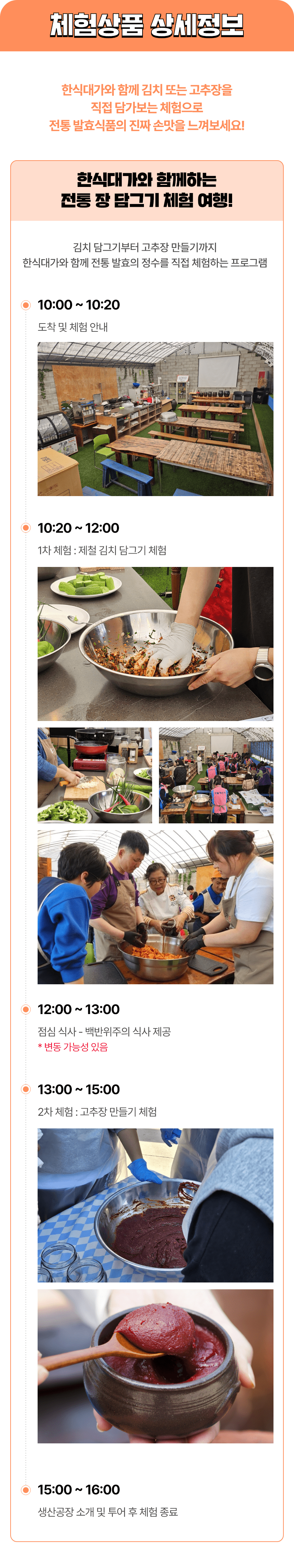 | 체험 시 유의사항 | - 체험장 내 장독대 및 발효 공간은 파손에 주의필요 - 실내외에서 활동이 이루어지므로 미끄럼주의 및 어린이 보호에 유의필요 - 체험 중 음식 재료를 만질 수 있어 위생장갑 착용 필수 - 반려동물 동반 불가능 |