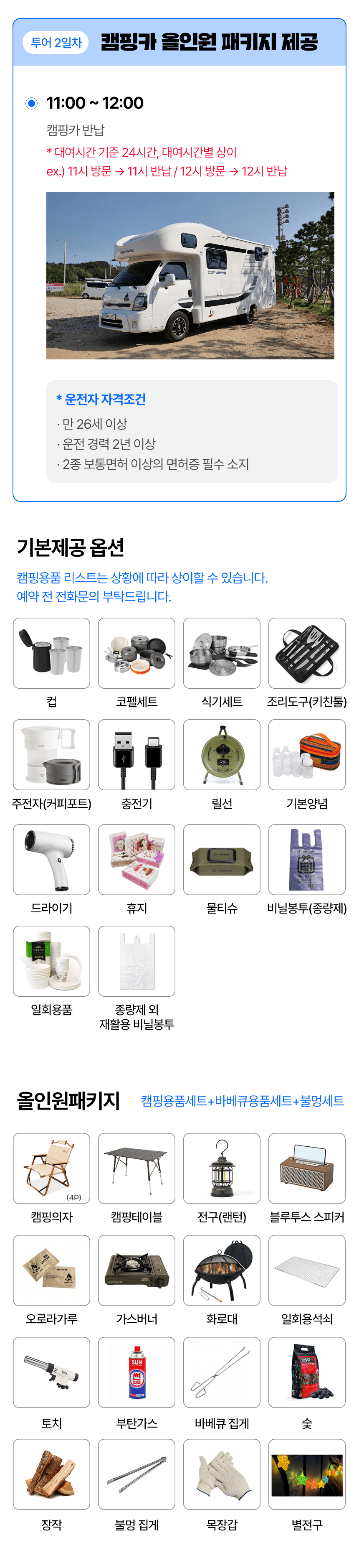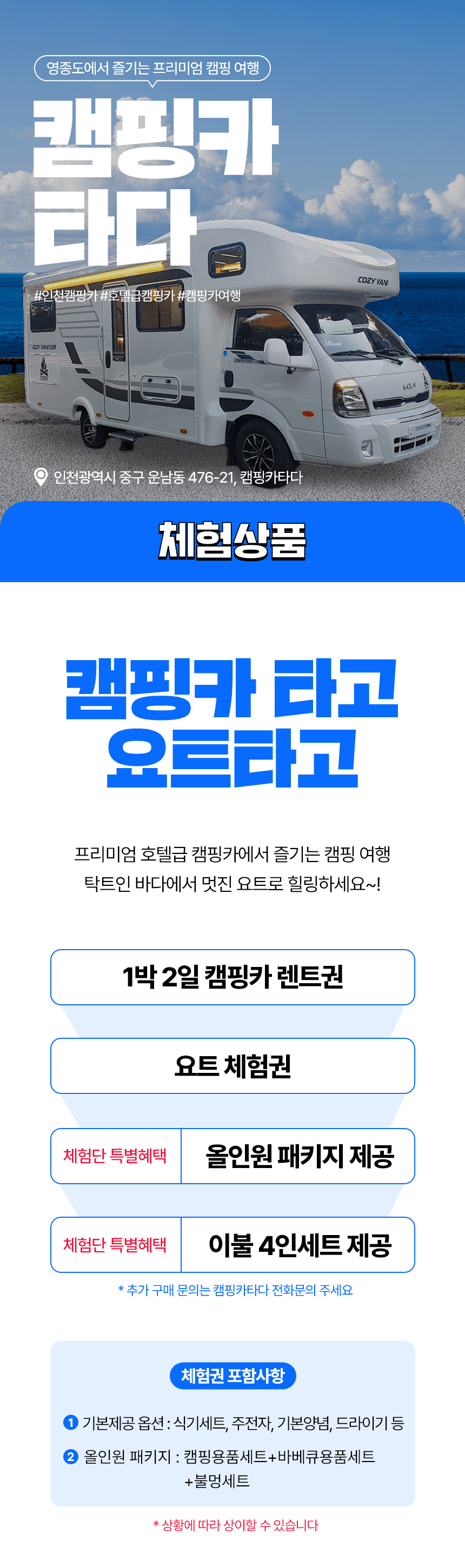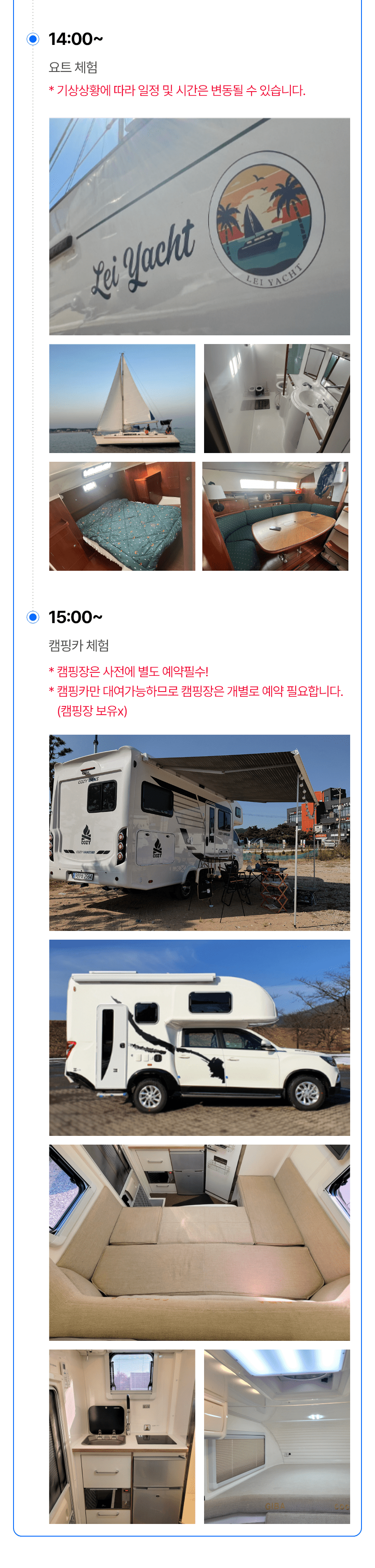 | 체험 시 유의사항 | - '캠핑카'만 대여하는 체험상품으로, 캠핑장은 별도로 알아보고 예약 필요 - 요트 탑승시간: 14시 (시간 엄수) - 캠핑카 내부/외부 파손/사고 주의 (캠핑카 출차시 차량 내외부 사진촬영 필수) - 운행, 주차 시에 차량간격 여유있게 운행 및 주차 필요 - 요트체험은 기상상황에 따라 일정 변동 가능성 있음 - 화기 사용시 화상주의 - 에어컨, 인덕션, 전자레인지, 드라이기, 커피포트 사용시 단독 사용 - 어닝 사용시 비 또는 바람불면 즉시 접어주어야되며, 취침, 외출 전에도 접어야함 - 어닝 파손시 보험 처리 불가 - 강풍, 호우주의보 등 발효시 어닝 사용불가 (어닝 손잡이 제공 불가) - 파손 / 사고시 휴차료, 수리비용 발생 - 반려동물 동반 불가능 ★ 운전자 조건 (필독) ① 만 26세 이상 ② 운전 경력 2년 이상 ③ 면허증 소지 필수 (2종 보통면허 운전가능한 사람) ④ 대형차 운전 유경험자 |