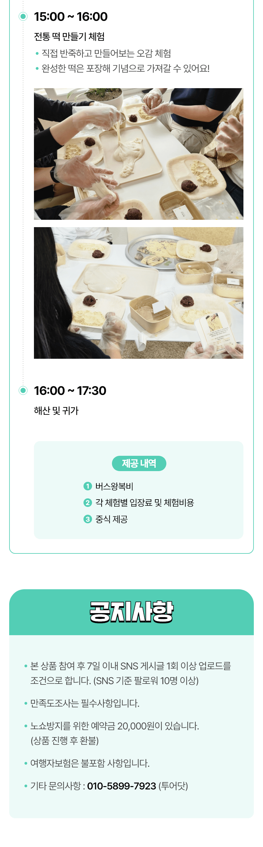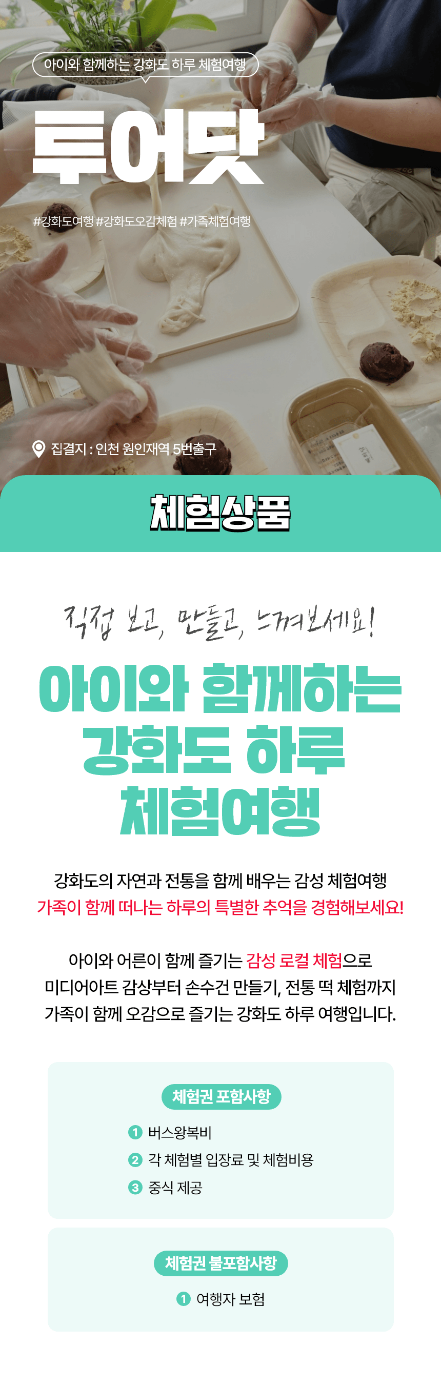 | 체험 시 유의사항 | - 집결시간 엄수 (10:00 / 원인재역 5번출구) - 체험시 신분증, 운동화 등 편한 복장 추천 - 기상상황에 따라 일정 변동될 수 있음 - 노쇼 방지를 위한 예치금 입금 필수 (1인 20,000원) - 여행자보험은 불포함사항 - 반려동물 동반 불가능 |