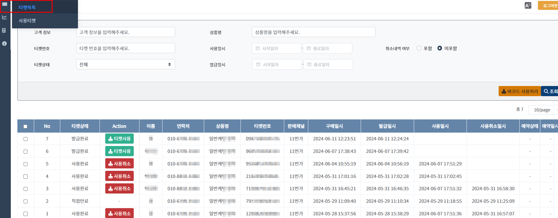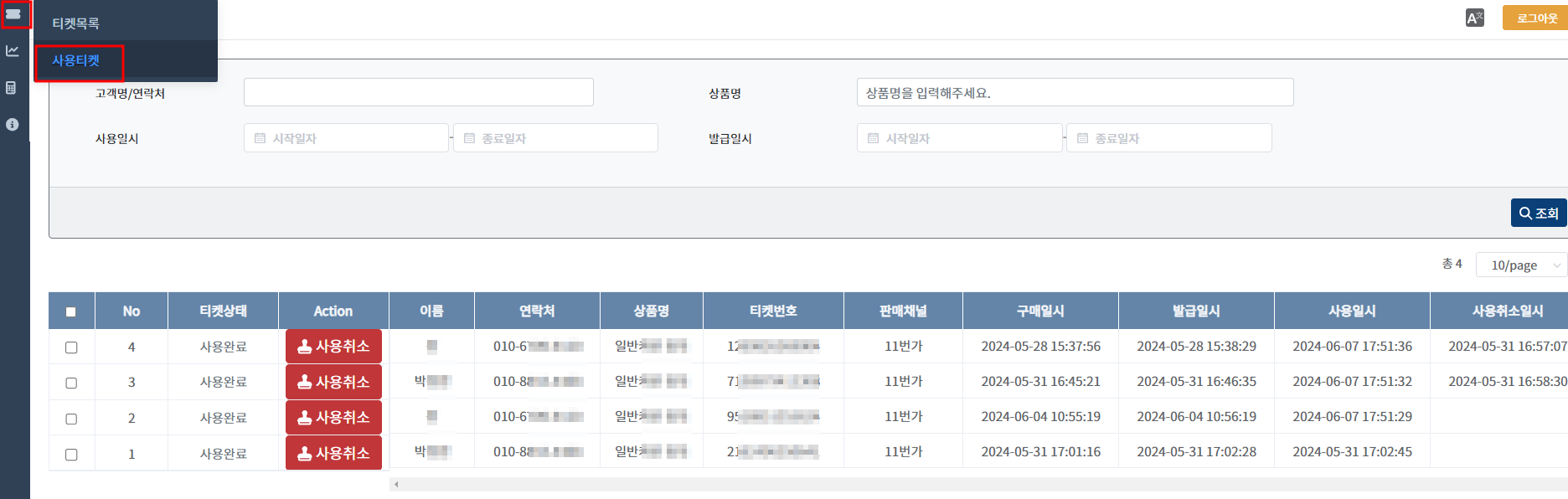 고객이 실제로 시설에 방문해서 입장승인이 된건이 몇건인지 확인을 하고자 할경우에는 좌측 메뉴바 상단의 사용티켓 메뉴에서 확인이 가능합니다.