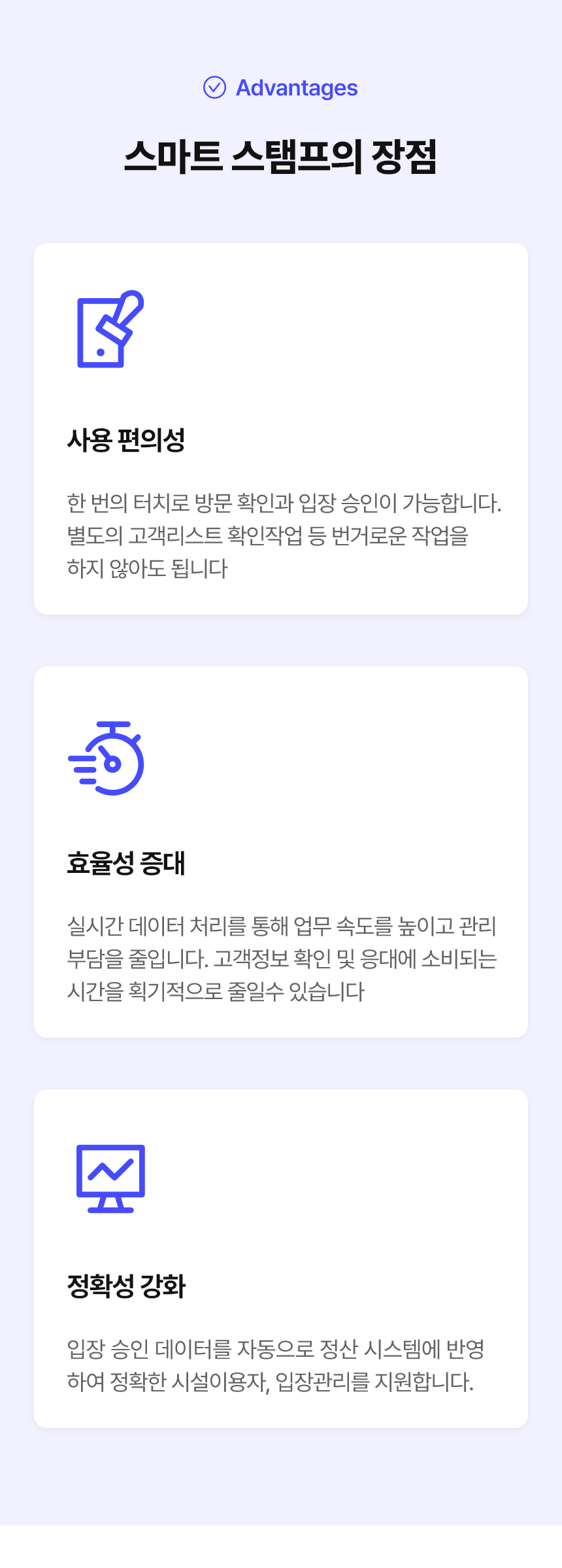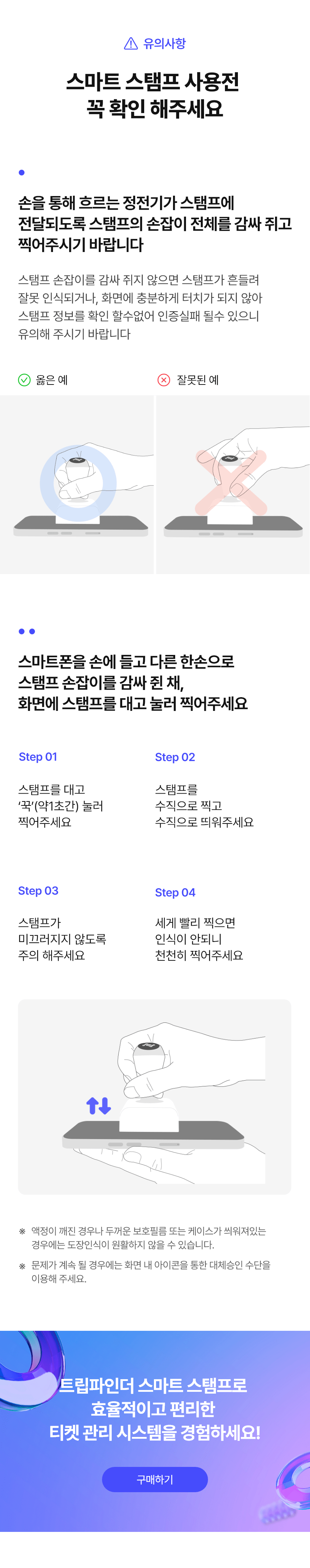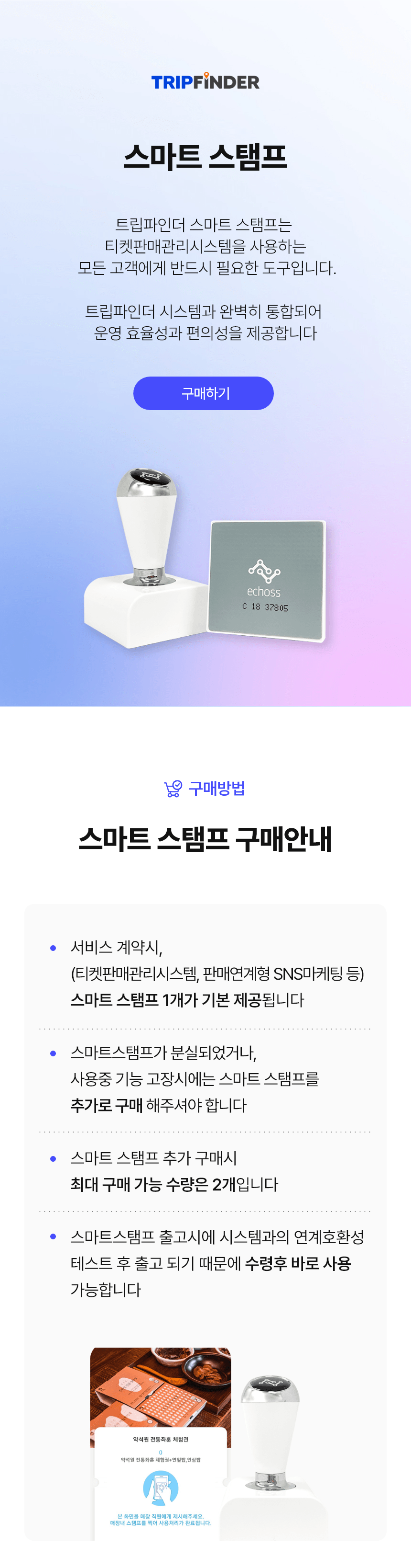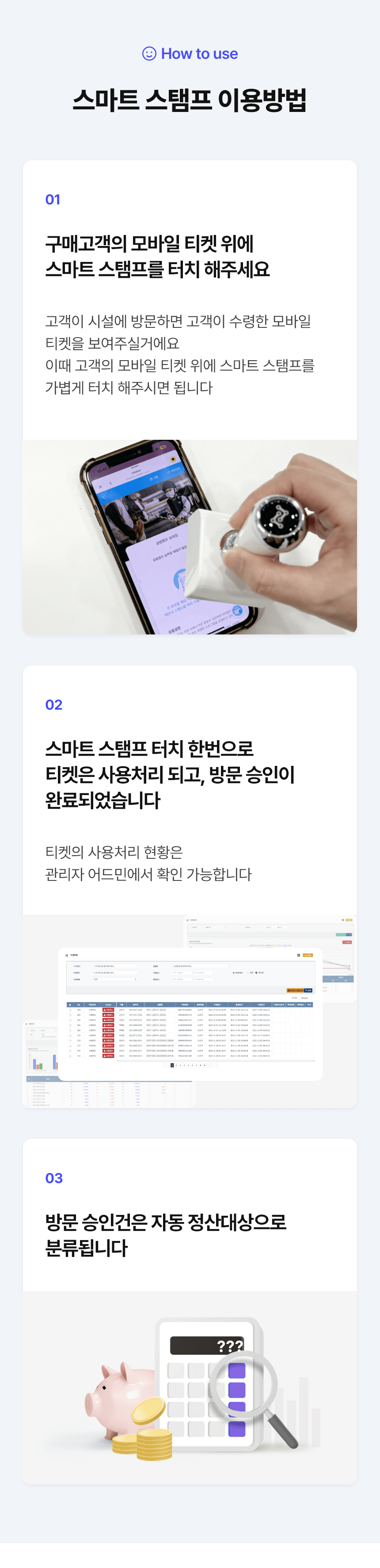 스마트 스탬프는 티켓을 구매한 고객이 시설에 방문을 했을때 티켓의 사용처리 및 시설입장 승인에 꼭 필요한 장치입니다