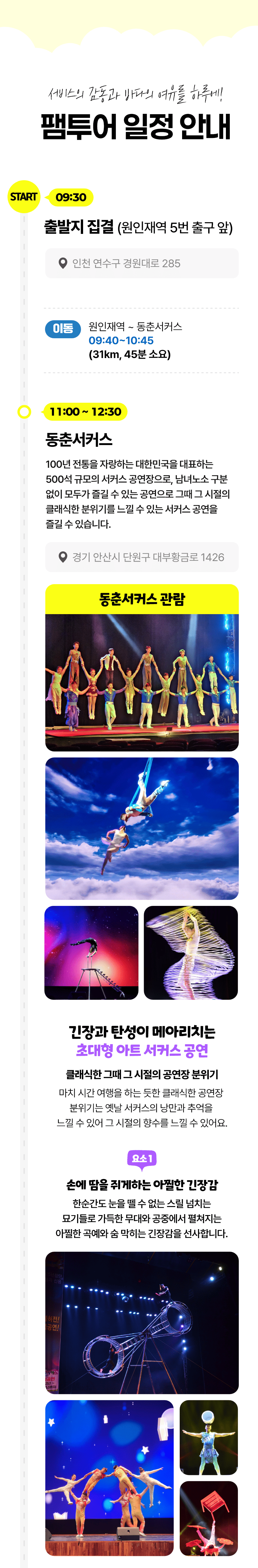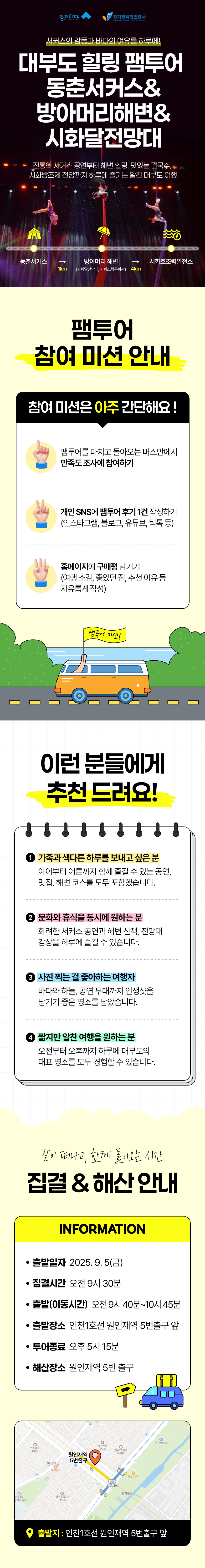 [대부도 힐링 팸투어(버스투어)] 동춘서커스, 방아머리해변, 시화달전망대, 칼국수까지 9.5(금), 오전 9시 30분, 원인재역 집결, 선착순 30명 모집